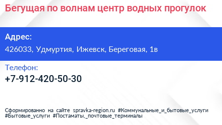 Бегущая по волнам, центр водных прогулок по адресу 426033, Удмуртия, Ижевск, Береговая, 1в в дальнейшем Организация, размещена в следующих категориях: