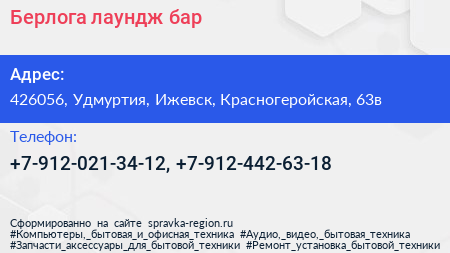 Берлога, лаундж-бар по адресу 426056, Удмуртия, Ижевск, Красногеройская, 63в в дальнейшем Организация, размещена в следующих категориях: