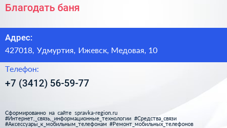 Благодать, баня по адресу 427018, Удмуртия, Ижевск, Медовая, 10 в дальнейшем Организация, размещена в следующих категориях: