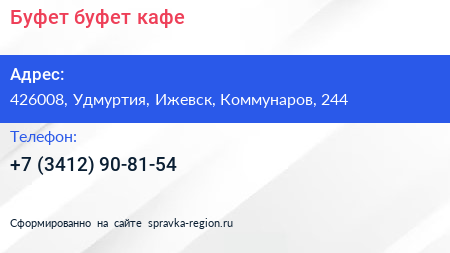 Буфет-буфет, кафе по адресу 426008, Удмуртия, Ижевск, Коммунаров, 244 в дальнейшем Организация, размещена в следующих категориях: