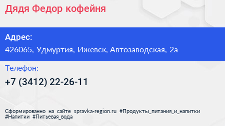 Дядя Федор, кофейня по адресу 426065, Удмуртия, Ижевск, Автозаводская, 2а в дальнейшем Организация, размещена в следующих категориях: