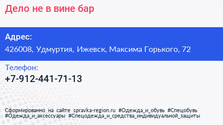Дело не в вине, бар по адресу 426008, Удмуртия, Ижевск, Максима Горького, 72 в дальнейшем Организация, размещена в следующих категориях: