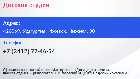 Детская студия по адресу 426069, Удмуртия, Ижевск, Нижняя, 30 в дальнейшем Организация, размещена в следующих категориях: