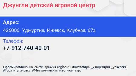 Джунгли, детский игровой центр по адресу 426006, Удмуртия, Ижевск, Клубная, 67а в дальнейшем Организация, размещена в следующих категориях: