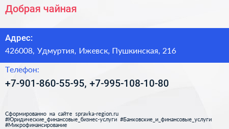 Добрая чайная по адресу 426008, Удмуртия, Ижевск, Пушкинская, 216 в дальнейшем Организация, размещена в следующих категориях: