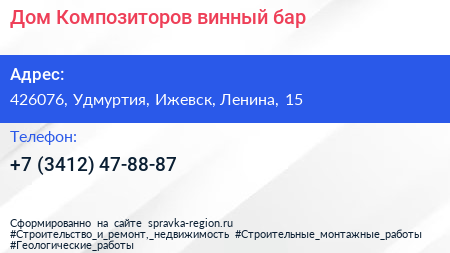 Дом Композиторов, винный бар по адресу 426076, Удмуртия, Ижевск, Ленина, 15 в дальнейшем Организация, размещена в следующих категориях:
