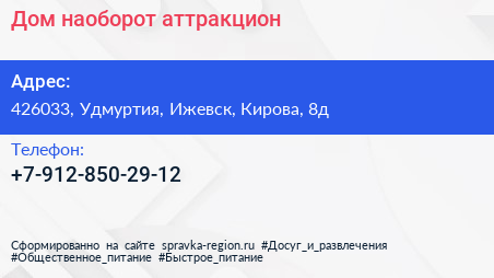 Дом наоборот, аттракцион по адресу 426033, Удмуртия, Ижевск, Кирова, 8д в дальнейшем Организация, размещена в следующих категориях: