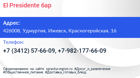 El Presidente, бар по адресу 426008, Удмуртия, Ижевск, Красногеройская, 16 в дальнейшем Организация, размещена в следующих категориях: