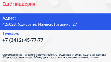 Ещё!, пиццерия по адресу 426028, Удмуртия, Ижевск, Гагарина, 27 в дальнейшем Организация, размещена в следующих категориях: