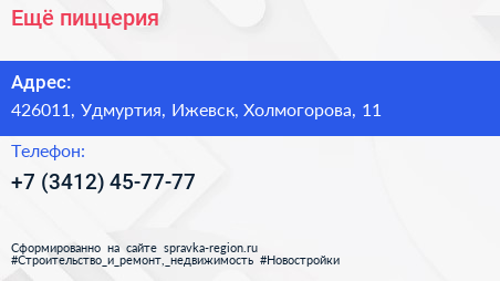 Ещё!, пиццерия по адресу 426011, Удмуртия, Ижевск, Холмогорова, 11 в дальнейшем Организация, размещена в следующих категориях: