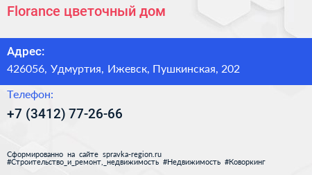 Florance, цветочный дом по адресу 426056, Удмуртия, Ижевск, Пушкинская, 202 в дальнейшем Организация, размещена в следующих категориях: