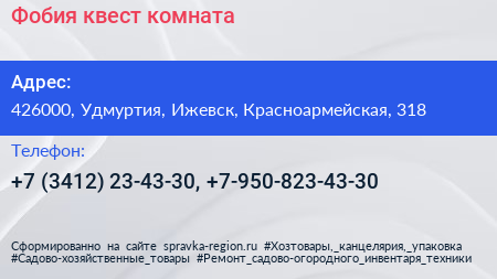 Фобия, квест-комната по адресу 426000, Удмуртия, Ижевск, Красноармейская, 318 в дальнейшем Организация, размещена в следующих категориях: