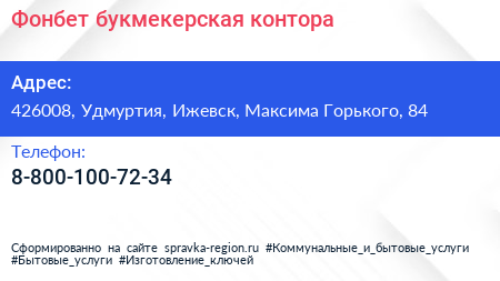 Фонбет, букмекерская контора по адресу 426008, Удмуртия, Ижевск, Максима Горького, 84 в дальнейшем Организация, размещена в следующих категориях: