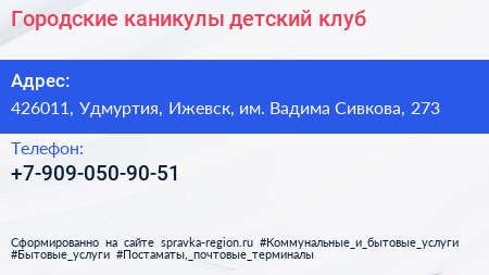 Городские каникулы, детский клуб по адресу 426011, Удмуртия, Ижевск, им. Вадима Сивкова, 273 в дальнейшем Организация, размещена в следующих категориях: