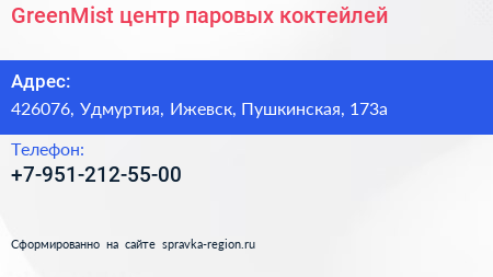 GreenMist, центр паровых коктейлей по адресу 426076, Удмуртия, Ижевск, Пушкинская, 173а в дальнейшем Организация, размещена в следующих категориях: