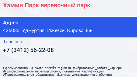 Хэмми Парк, веревочный парк по адресу 426033, Удмуртия, Ижевск, Кирова, 8ж в дальнейшем Организация, размещена в следующих категориях: