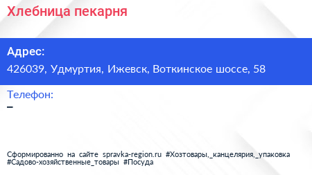 Хлебница, пекарня по адресу 426039, Удмуртия, Ижевск, Воткинское шоссе, 58 в дальнейшем Организация, размещена в следующих категориях:
