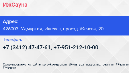 ИжСауна по адресу 426003, Удмуртия, Ижевск, проезд Жечева, 20 в дальнейшем Организация, размещена в следующих категориях: