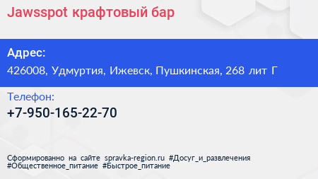Jawsspot, крафтовый бар по адресу 426008, Удмуртия, Ижевск, Пушкинская, 268 лит Г в дальнейшем Организация, размещена в следующих категориях:
