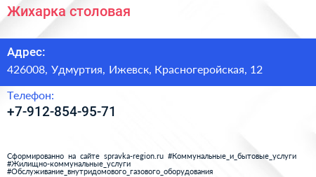 Жихарка, столовая по адресу 426008, Удмуртия, Ижевск, Красногеройская, 12 в дальнейшем Организация, размещена в следующих категориях: