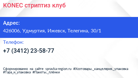 KONEC, стриптиз-клуб по адресу 426006, Удмуртия, Ижевск, Телегина, 30/1 в дальнейшем Организация, размещена в следующих категориях: