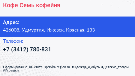 Кофе Семь, кофейня по адресу 426008, Удмуртия, Ижевск, Красная, 133 в дальнейшем Организация, размещена в следующих категориях: