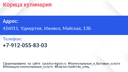 Корица, кулинария по адресу 426011, Удмуртия, Ижевск, Майская, 13Б в дальнейшем Организация, размещена в следующих категориях:
