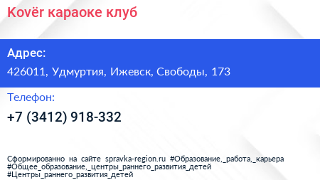 Kоvёr, караоке-клуб по адресу 426011, Удмуртия, Ижевск, Свободы, 173 в дальнейшем Организация, размещена в следующих категориях: