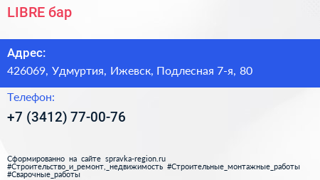 LIBRE, бар по адресу 426069, Удмуртия, Ижевск, Подлесная 7-я, 80 в дальнейшем Организация, размещена в следующих категориях: