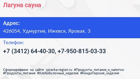 Лагуна, сауна по адресу 426054, Удмуртия, Ижевск, Яровая, 3 в дальнейшем Организация, размещена в следующих категориях: