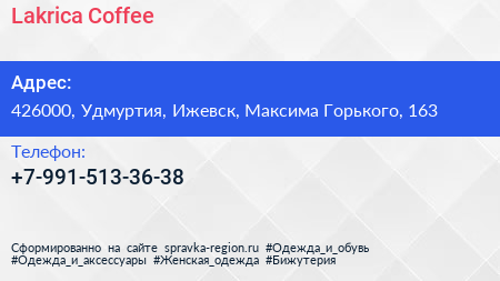 Lakrica Coffee по адресу 426000, Удмуртия, Ижевск, Максима Горького, 163 в дальнейшем Организация, размещена в следующих категориях: