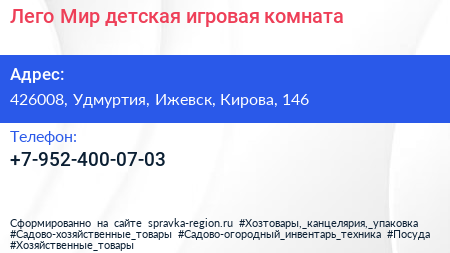Лего Мир, детская игровая комната по адресу 426008, Удмуртия, Ижевск, Кирова, 146 в дальнейшем Организация, размещена в следующих категориях: