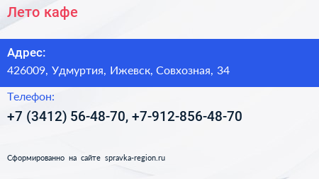 Лето, кафе по адресу 426009, Удмуртия, Ижевск, Совхозная, 34 в дальнейшем Организация, размещена в следующих категориях: