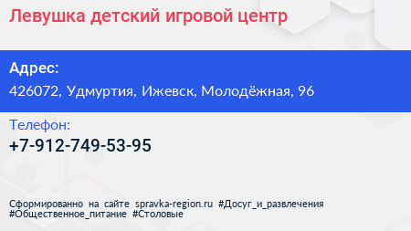 Левушка, детский игровой центр по адресу 426072, Удмуртия, Ижевск, Молодёжная, 96 в дальнейшем Организация, размещена в следующих категориях: