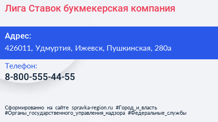 Лига Ставок, букмекерская компания по адресу 426011, Удмуртия, Ижевск, Пушкинская, 280а в дальнейшем Организация, размещена в следующих категориях:
