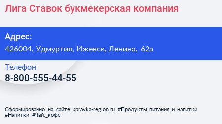 Лига Ставок, букмекерская компания по адресу 426004, Удмуртия, Ижевск, Ленина, 62а в дальнейшем Организация, размещена в следующих категориях: