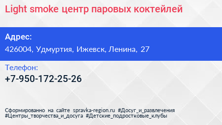 Light smoke, центр паровых коктейлей по адресу 426004, Удмуртия, Ижевск, Ленина, 27 в дальнейшем Организация, размещена в следующих категориях: