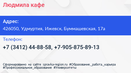 Людмила, кафе по адресу 426050, Удмуртия, Ижевск, Буммашевская, 17а в дальнейшем Организация, размещена в следующих категориях: