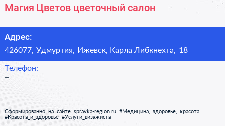 Магия Цветов, цветочный салон по адресу 426077, Удмуртия, Ижевск, Карла Либкнехта, 18 в дальнейшем Организация, размещена в следующих категориях: