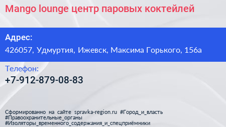 Mango lounge, центр паровых коктейлей по адресу 426057, Удмуртия, Ижевск, Максима Горького, 156а в дальнейшем Организация, размещена в следующих категориях: