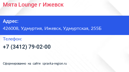 Мята Lounge, г. Ижевск по адресу 426008, Удмуртия, Ижевск, Удмуртская, 255Б в дальнейшем Организация, размещена в следующих категориях: