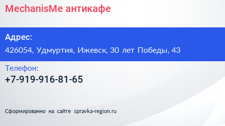 MechanisMe, антикафе по адресу 426054, Удмуртия, Ижевск, 30 лет Победы, 43 в дальнейшем Организация, размещена в следующих категориях: