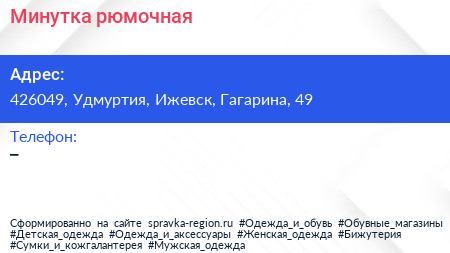 Минутка, рюмочная по адресу 426049, Удмуртия, Ижевск, Гагарина, 49 в дальнейшем Организация, размещена в следующих категориях:
