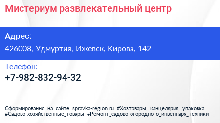 Мистериум, развлекательный центр по адресу 426008, Удмуртия, Ижевск, Кирова, 142 в дальнейшем Организация, размещена в следующих категориях: