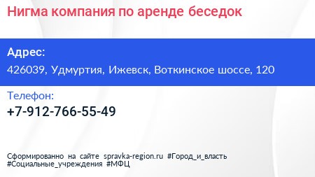Нигма, компания по аренде беседок по адресу 426039, Удмуртия, Ижевск, Воткинское шоссе, 120 в дальнейшем Организация, размещена в следующих категориях: