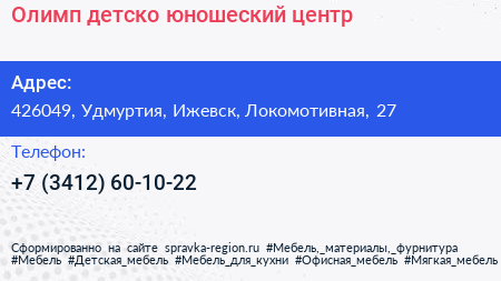 Олимп, детско-юношеский центр по адресу 426049, Удмуртия, Ижевск, Локомотивная, 27 в дальнейшем Организация, размещена в следующих категориях: