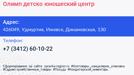 Олимп, детско-юношеский центр по адресу 426049, Удмуртия, Ижевск, Динамовская, 130 в дальнейшем Организация, размещена в следующих категориях: