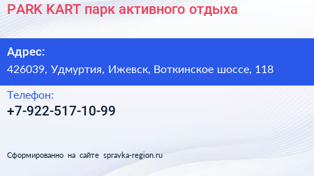 PARK KART, парк активного отдыха по адресу 426039, Удмуртия, Ижевск, Воткинское шоссе, 118 в дальнейшем Организация, размещена в следующих категориях: