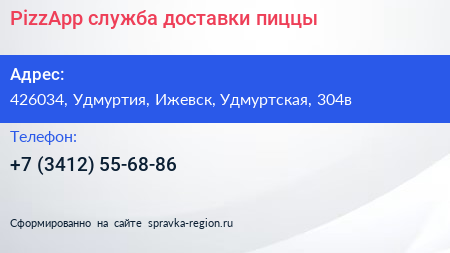 PizzApp, служба доставки пиццы по адресу 426034, Удмуртия, Ижевск, Удмуртская, 304в в дальнейшем Организация, размещена в следующих категориях: