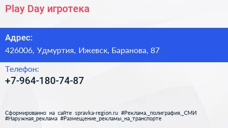 Play Day, игротека по адресу 426006, Удмуртия, Ижевск, Баранова, 87 в дальнейшем Организация, размещена в следующих категориях: